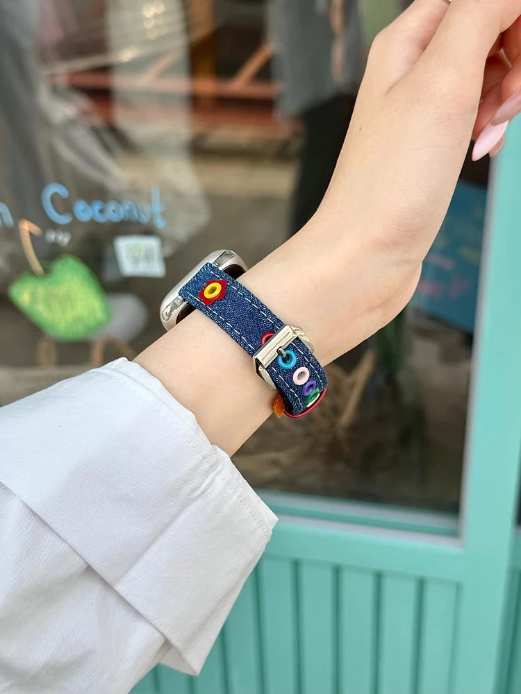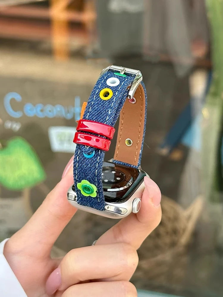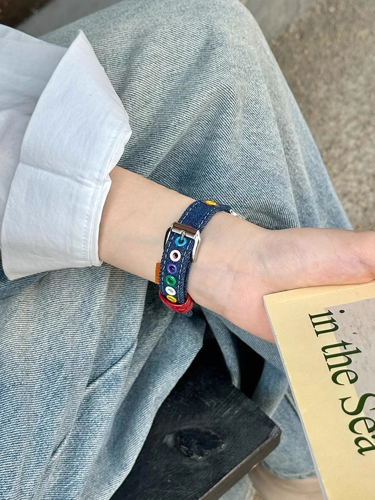 Turn everyday outfits into statement looks with this slim denim + leather Apple Watch band featuring colorful dopamine studs and a glossy keeper. Designed for comfort and style, it’s a playful upgrade to your smartwatch.